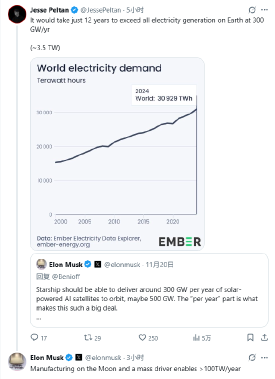 马斯克23日回应称,“如果我们将月球制造与高质量投影仪结合起来,我们每年可以达到100太瓦(功率输出/生产能力)以上。”